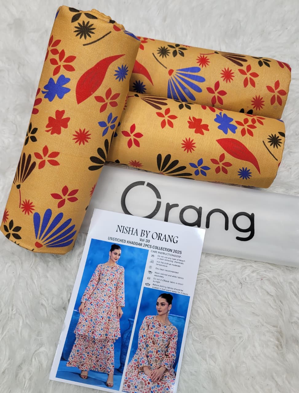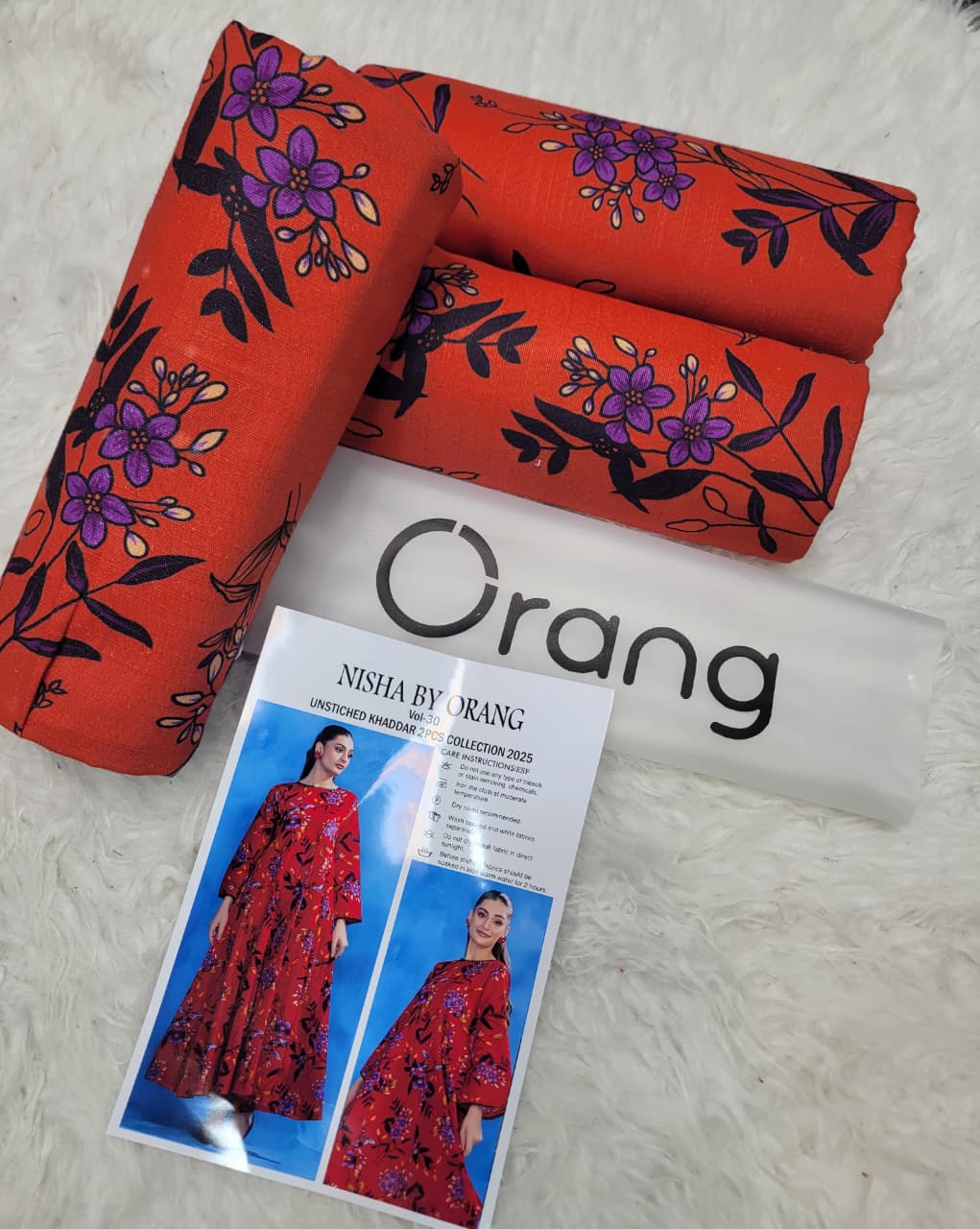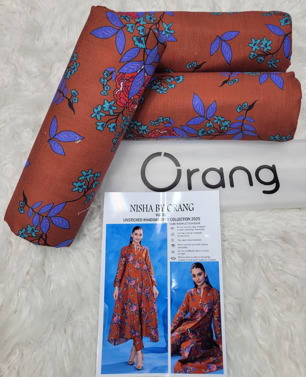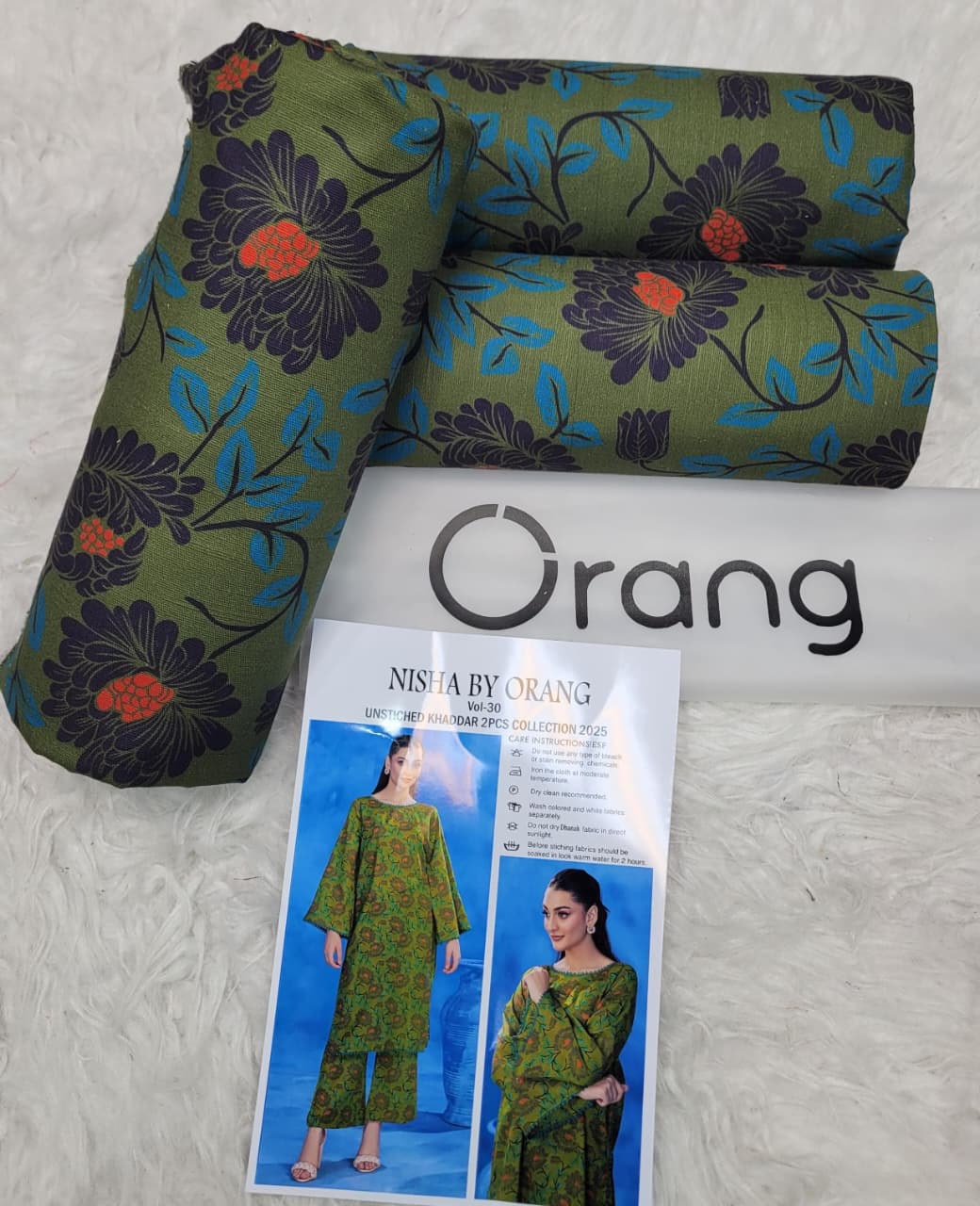 Vibrant Style with Guaranteed Quality! Introducing the vibrant Orang Khaddar collection, a perfect blend of comfort and style for your everyday wardrobe. This 2-piece set features premium Khaddar fabric with eye-catching prints and a 100% color guarantee!✨ Product Details & Selling Points Brand/Collection: Orang Fabric: Premium Khaddar (Ideal for casual, everyday, or moderate weather wear) Set Includes:Printed Shirt (Unstitched Fabric)Printed Trouser (Unstitched Fabric) Ease of Stitching: Generous $3.25$ Meter cutting provided, ensuring easy and proper stitching for various sizes. Quality Guarantee: Colour Fabric Guaranteed $100\%$ (No fading or bleeding worries).Presentation: Comes with Proper Bag Packing, making it ideal for gifting or neat storage