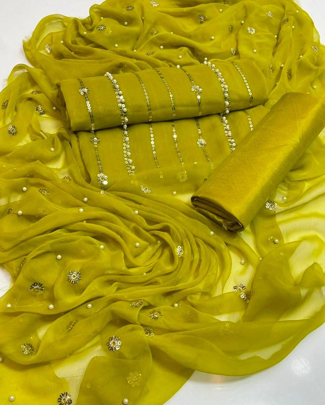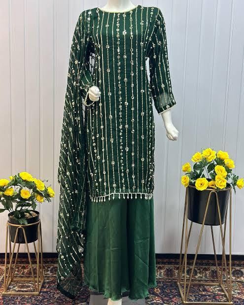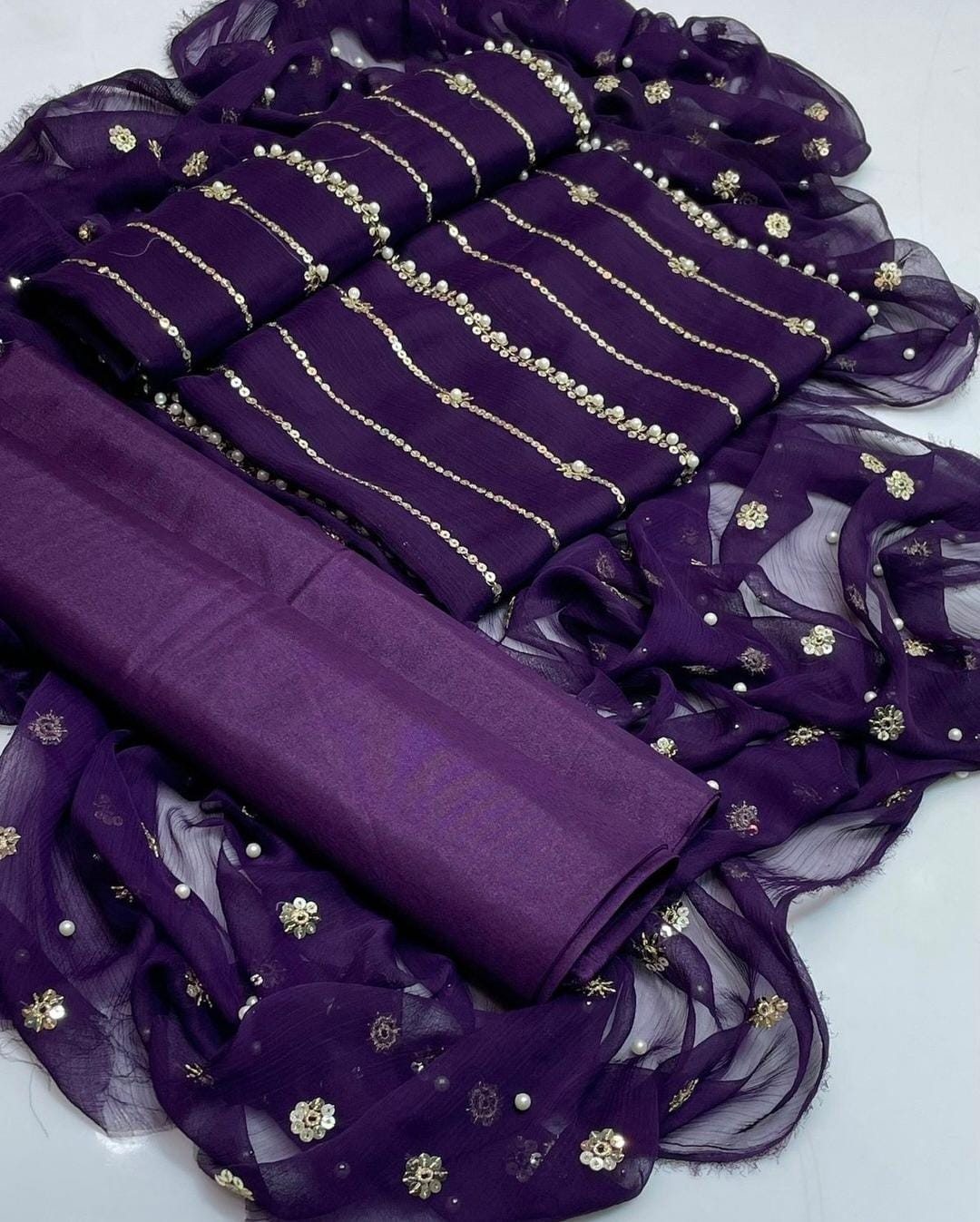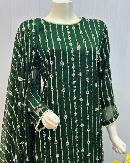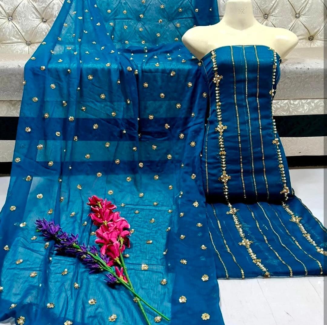 Dazzle with Heavy Pearl & Beats Work! Step into the spotlight with our New Trending Hit Collection 2K25/2K26! This gorgeous 03 Piece Heavy Suit features exquisite Indian Chiffon and stunning Banarsi detailing, perfect for weddings, parties, and special occasions. We guarantee the best quality at the best rates! ✨ Product Breakdown & Highlights Collection Focus: Heavy Embroidery, Pearl, Beads, and Sequence Work Suit Type: 03 Piece Heavy Ensemble (Shirt, Dupatta, Trouser) Available Colors: 10 Vibrant Colors to choose from. 1. Shirt (2.5 Gaz) Fabric: Premium Indian Chiffon Work: Heavy Embroidery embellished with Pearl and Beats (Beads) work, combined with Tilla (metallic thread) and Sequence. Design Note: Features the Same Heavy Embroidery on both Front and Back for a luxurious, all-around look. 2. Dupatta (2.5 Gaz) Fabric: Matching Indian Chiffon Work: Heavy Pearl, Sequence, and Beats work, following the latest Trending designs. 3. Trouser Fabric: Luxurious Katan Silk Shine (Imported Amazing Quality) 🛑 Important Note to Customers Design Assurance: The final product design will be Exactly the Same as the Open Picture (Design Same As Open Pic).