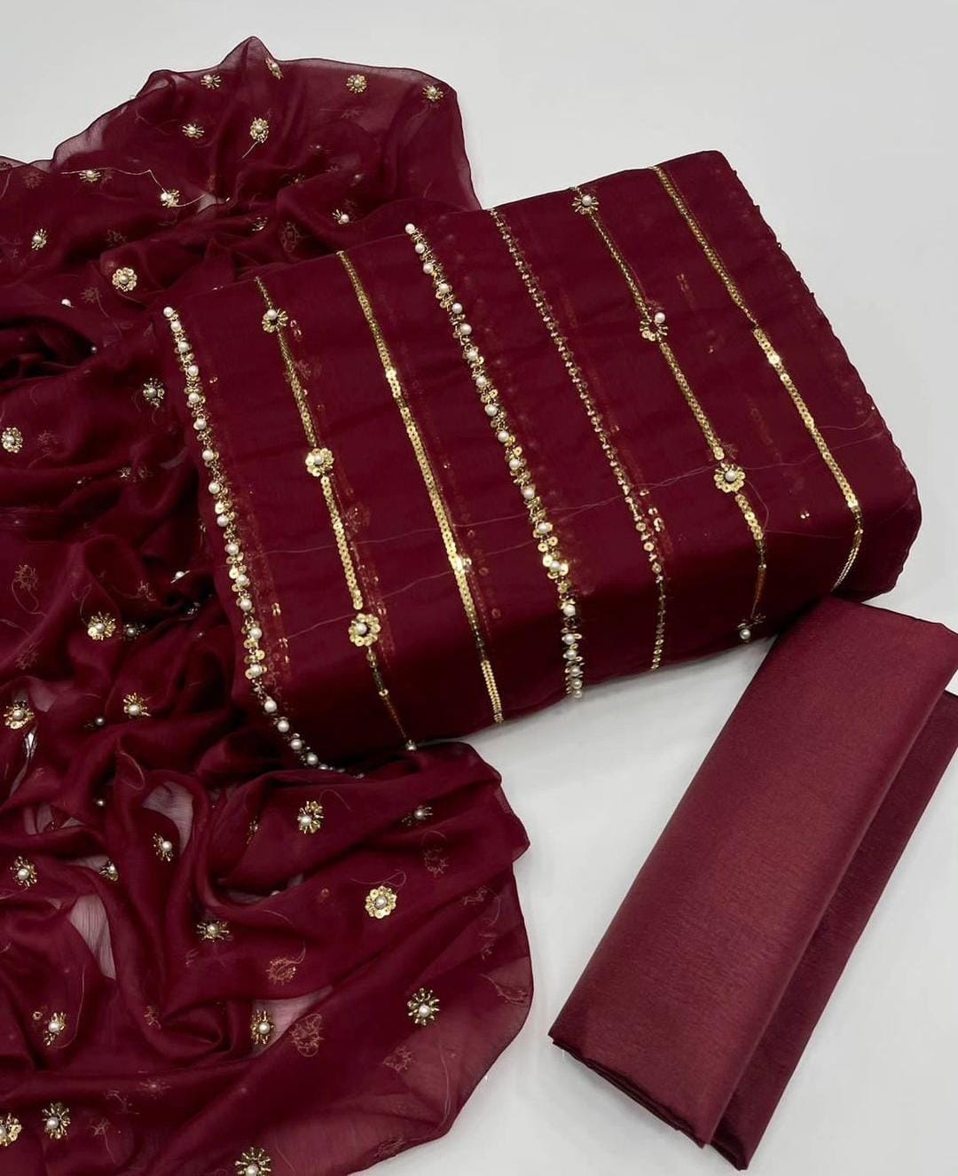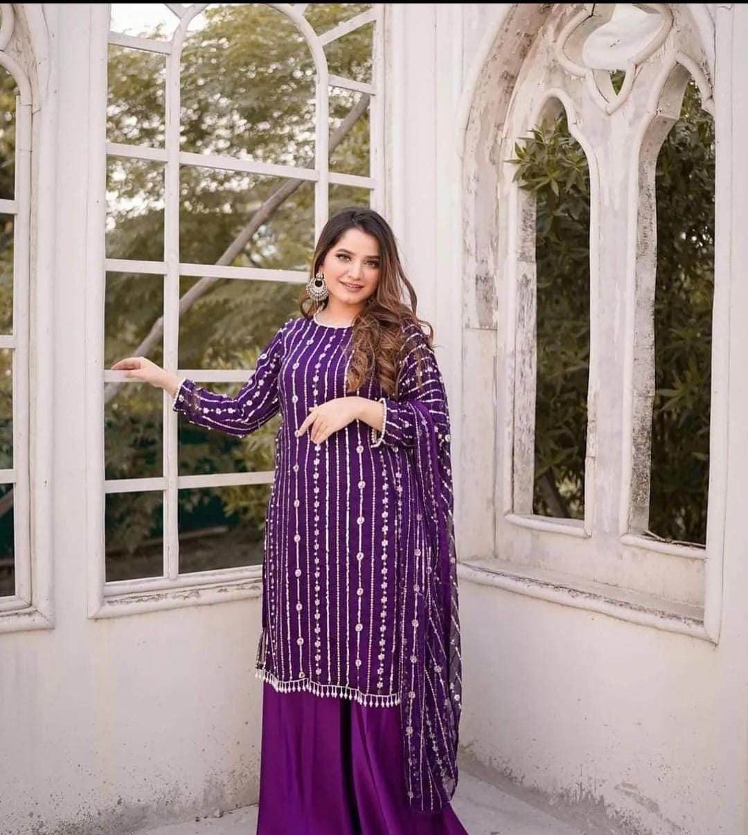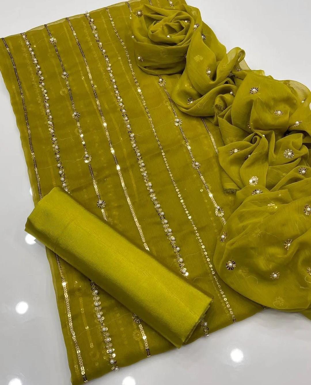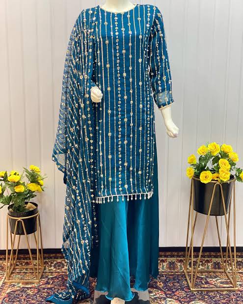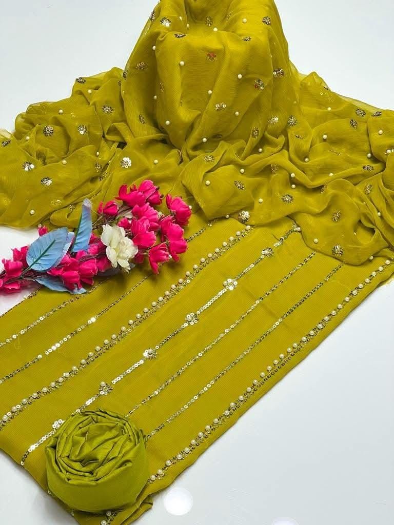 Dazzle with Heavy Pearl & Beats Work! Step into the spotlight with our New Trending Hit Collection 2K25/2K26! This gorgeous 03 Piece Heavy Suit features exquisite Indian Chiffon and stunning Banarsi detailing, perfect for weddings, parties, and special occasions. We guarantee the best quality at the best rates! ✨ Product Breakdown & Highlights Collection Focus: Heavy Embroidery, Pearl, Beads, and Sequence Work Suit Type: 03 Piece Heavy Ensemble (Shirt, Dupatta, Trouser) Available Colors: 10 Vibrant Colors to choose from. 1. Shirt (2.5 Gaz) Fabric: Premium Indian Chiffon Work: Heavy Embroidery embellished with Pearl and Beats (Beads) work, combined with Tilla (metallic thread) and Sequence. Design Note: Features the Same Heavy Embroidery on both Front and Back for a luxurious, all-around look. 2. Dupatta (2.5 Gaz) Fabric: Matching Indian Chiffon Work: Heavy Pearl, Sequence, and Beats work, following the latest Trending designs. 3. Trouser Fabric: Luxurious Katan Silk Shine (Imported Amazing Quality) 🛑 Important Note to Customers Design Assurance: The final product design will be Exactly the Same as the Open Picture (Design Same As Open Pic).