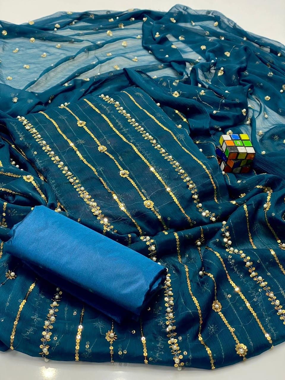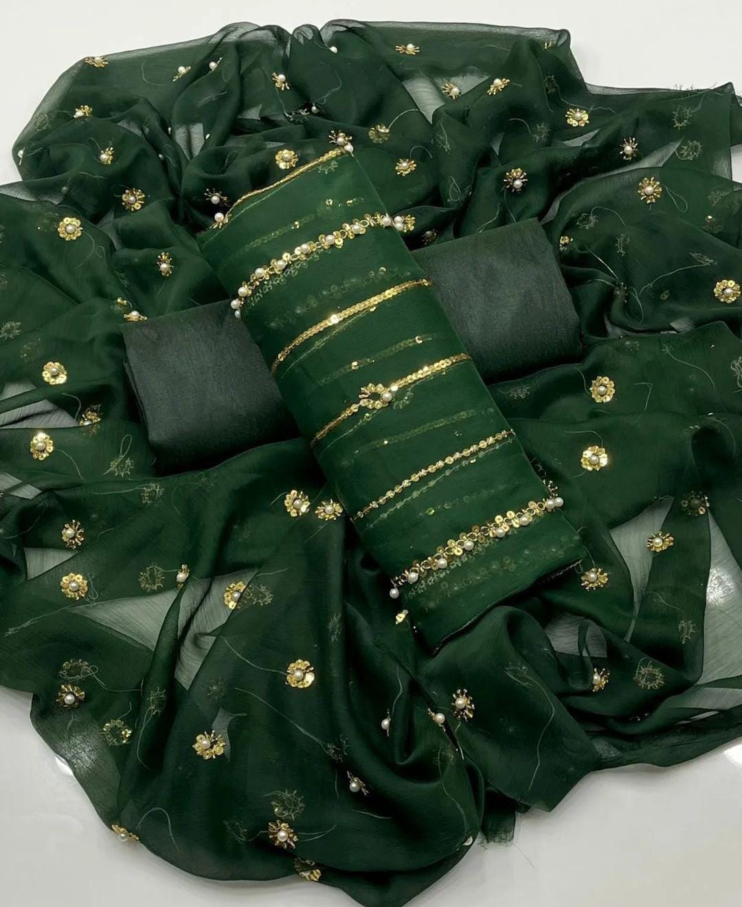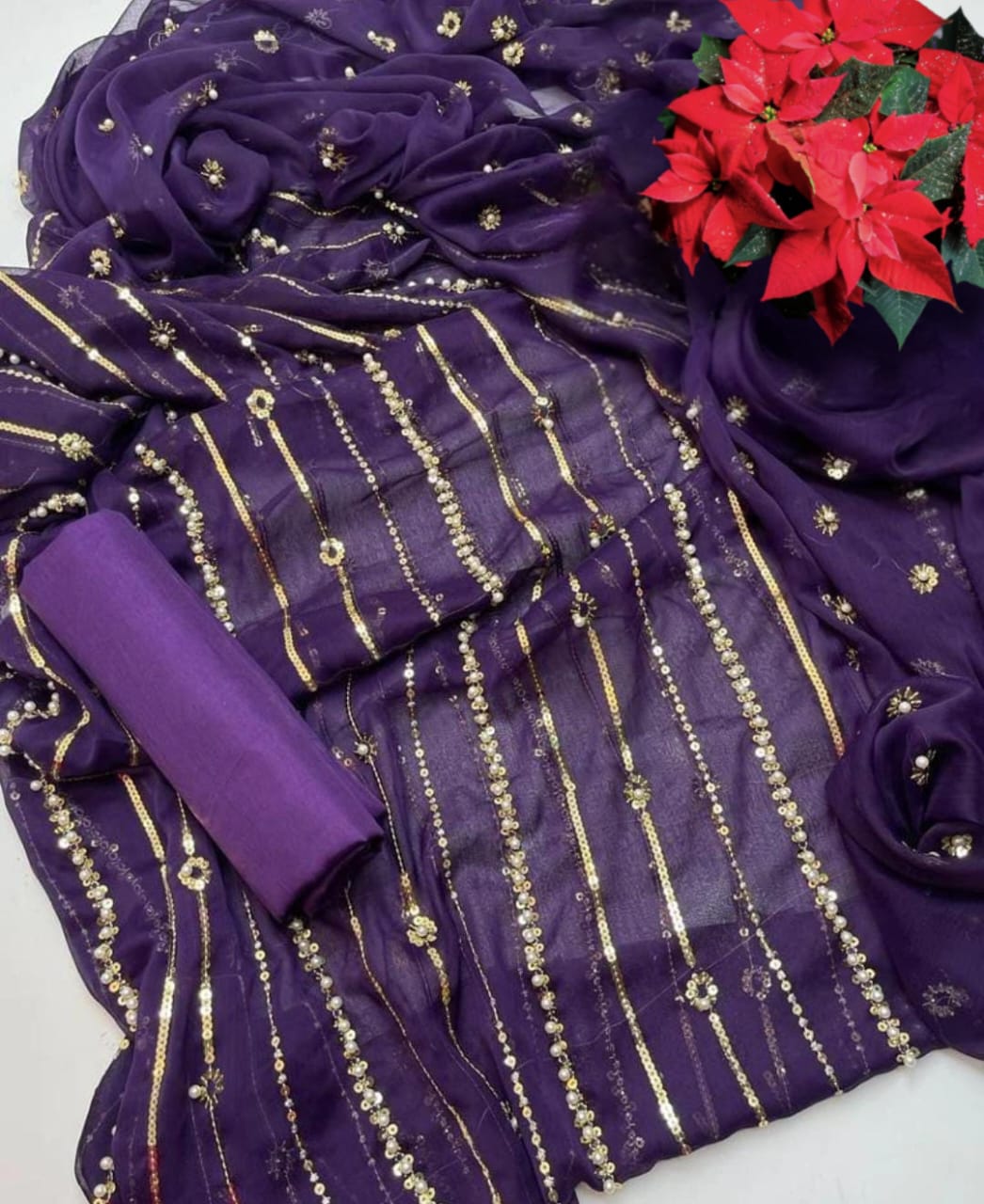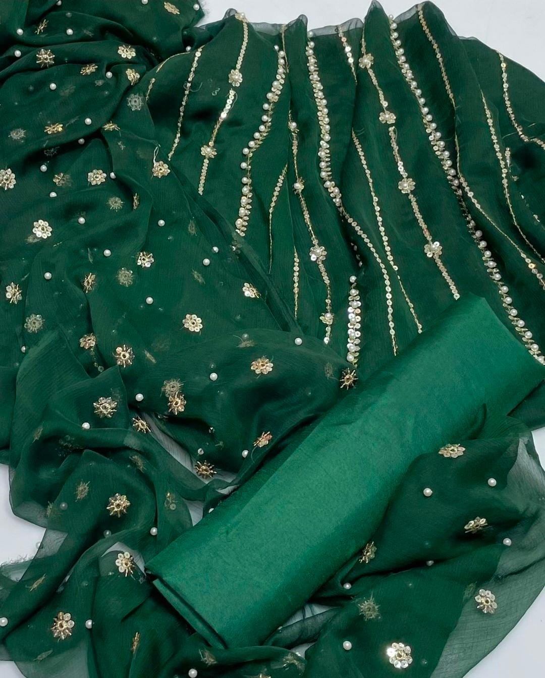 Dazzle with Heavy Pearl & Beats Work! Step into the spotlight with our New Trending Hit Collection 2K25/2K26! This gorgeous 03 Piece Heavy Suit features exquisite Indian Chiffon and stunning Banarsi detailing, perfect for weddings, parties, and special occasions. We guarantee the best quality at the best rates! ✨ Product Breakdown & Highlights Collection Focus: Heavy Embroidery, Pearl, Beads, and Sequence Work Suit Type: 03 Piece Heavy Ensemble (Shirt, Dupatta, Trouser) Available Colors: 10 Vibrant Colors to choose from. 1. Shirt (2.5 Gaz) Fabric: Premium Indian Chiffon Work: Heavy Embroidery embellished with Pearl and Beats (Beads) work, combined with Tilla (metallic thread) and Sequence. Design Note: Features the Same Heavy Embroidery on both Front and Back for a luxurious, all-around look. 2. Dupatta (2.5 Gaz) Fabric: Matching Indian Chiffon Work: Heavy Pearl, Sequence, and Beats work, following the latest Trending designs. 3. Trouser Fabric: Luxurious Katan Silk Shine (Imported Amazing Quality) 🛑 Important Note to Customers Design Assurance: The final product design will be Exactly the Same as the Open Picture (Design Same As Open Pic).